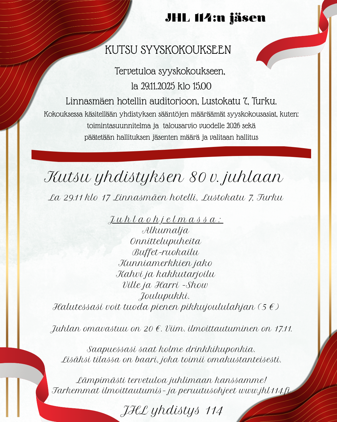 Tapahtumat on vain JHL 114 jäsenille. Tilaisuuksiin mahtuu 200 henkilöä.